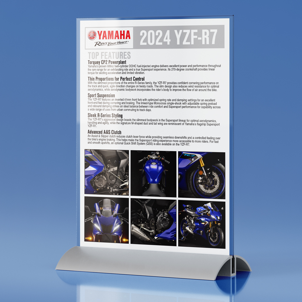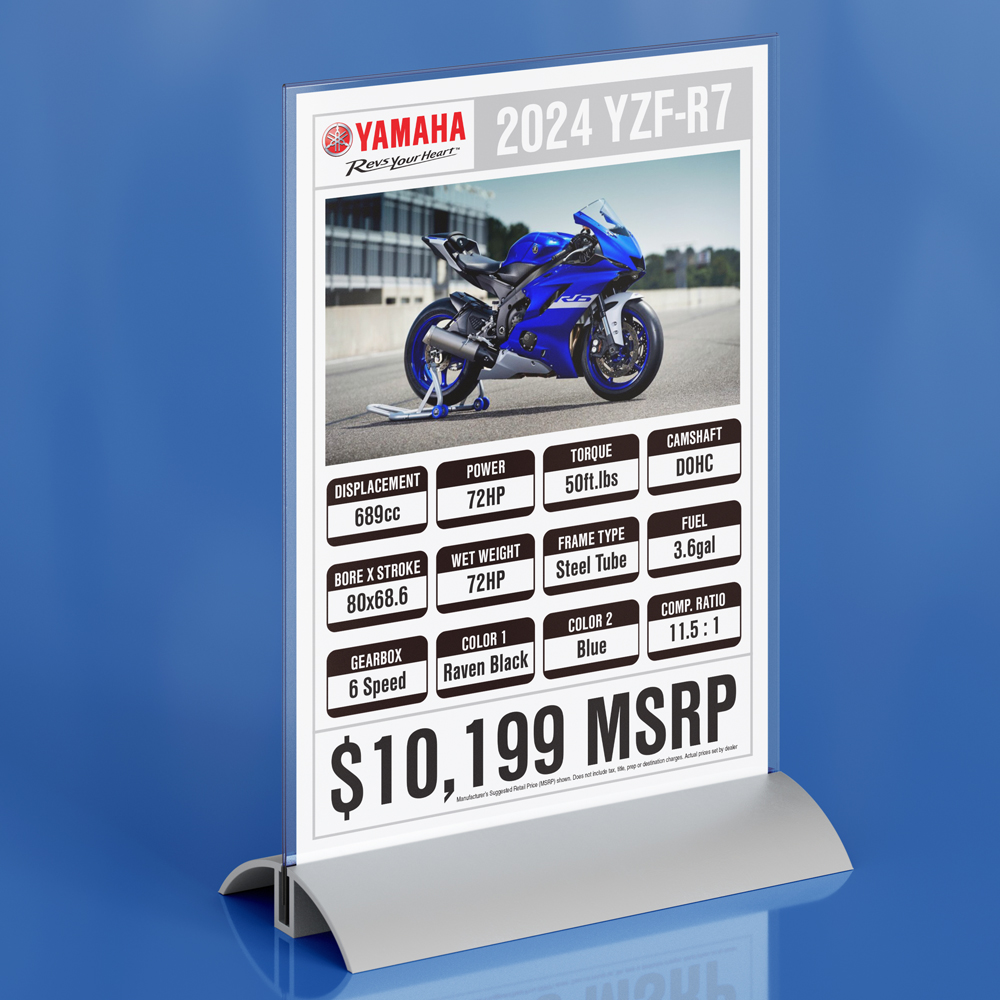 These tags are used to show quick infographics about a particular Yamaha motorcycle for sales and marketing in authorized Yamaha dealerships. Almost all Yamaha models used this format. In this example, a 2024 YZF-R is used.